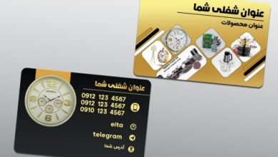 دانلود فوری کارت ویزیت لایه باز 9*6 دورو ساعت ایستاده و لوازم آشپزخانه با لینک مستقیم
